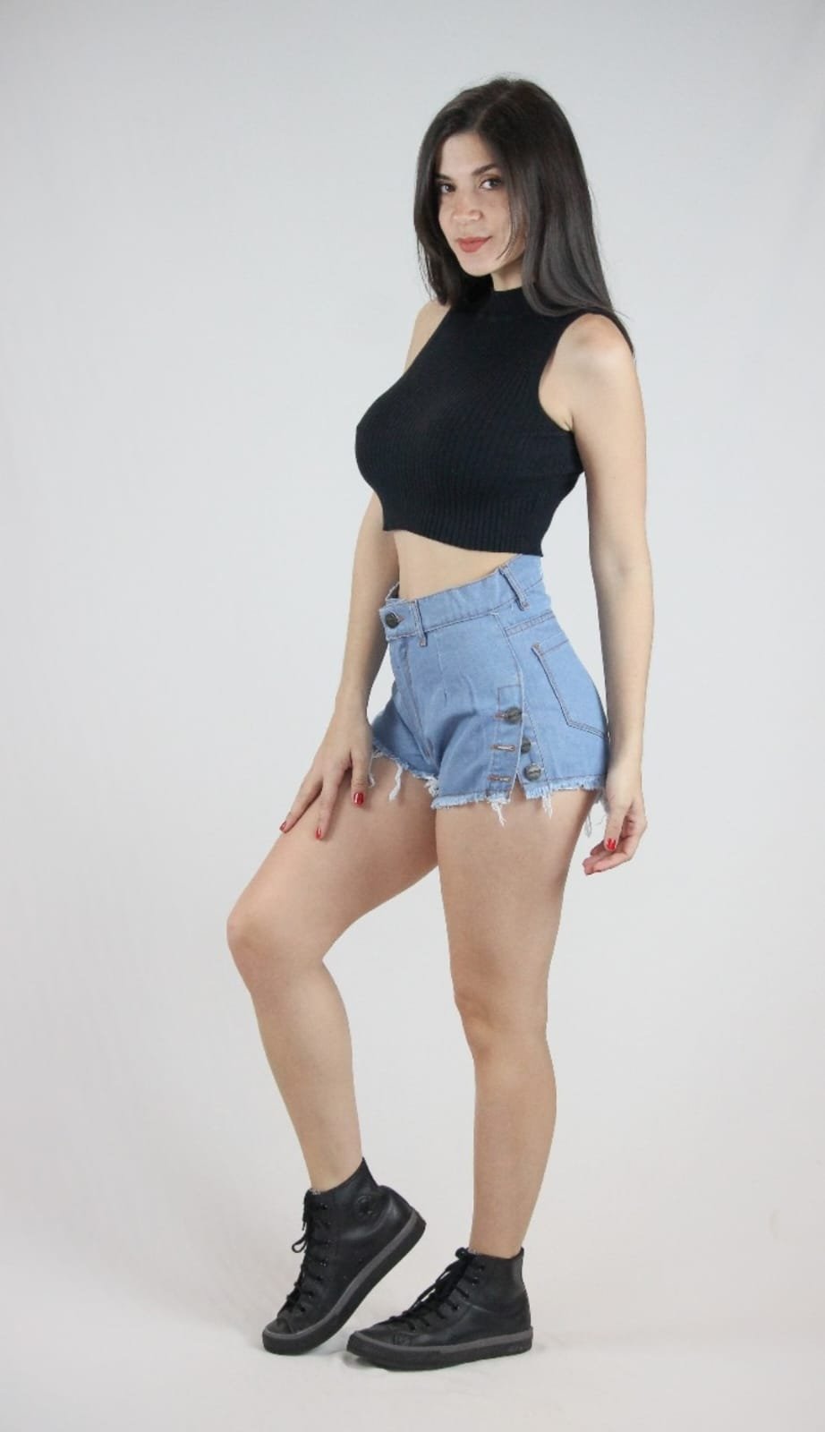 Fabricado 100% en denim de algodón, este short ofrece comodidad y durabilidad, con su diseño de botones a los costados y ruedo desflecado.
