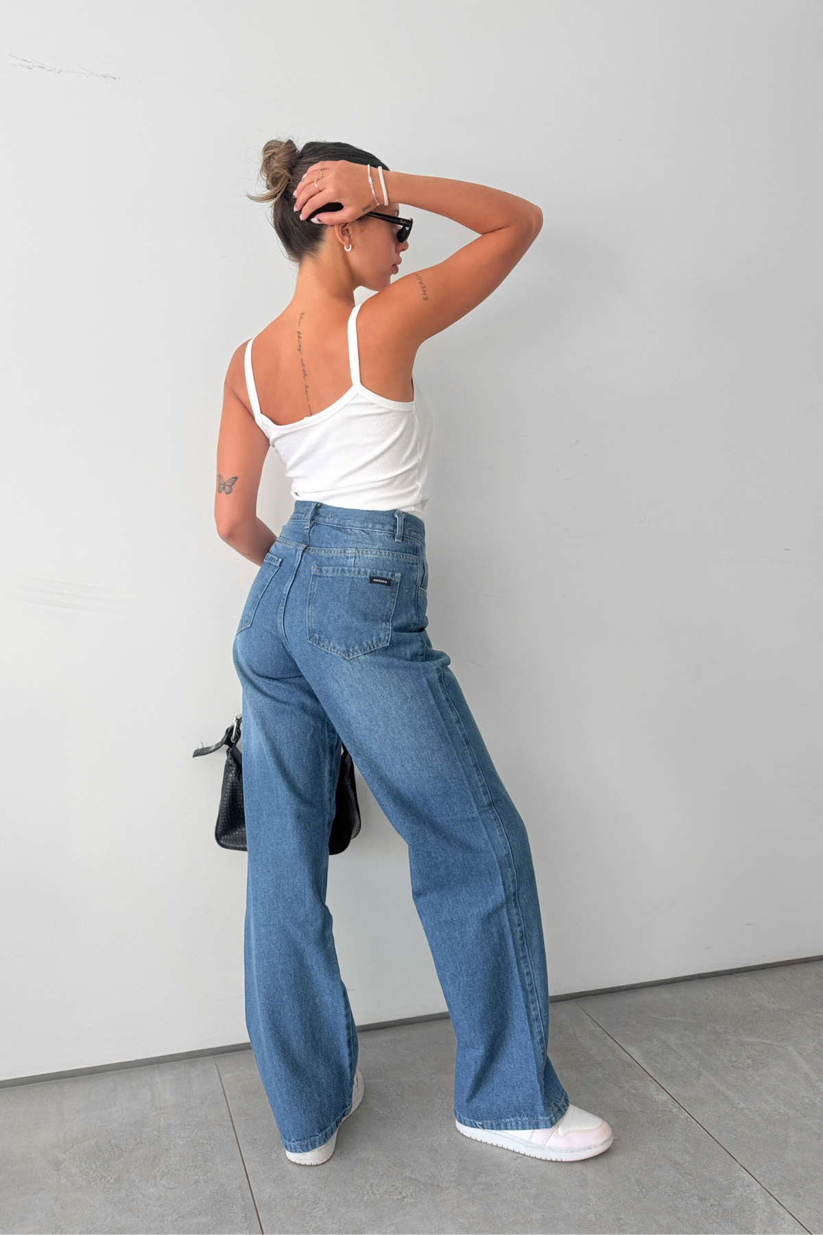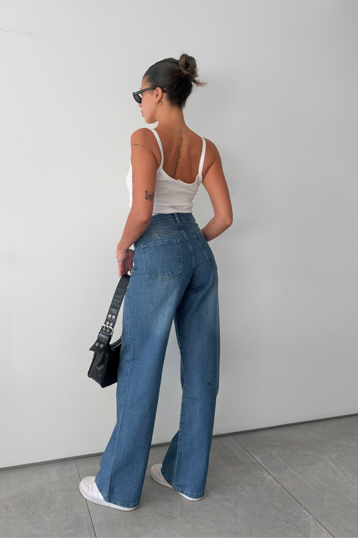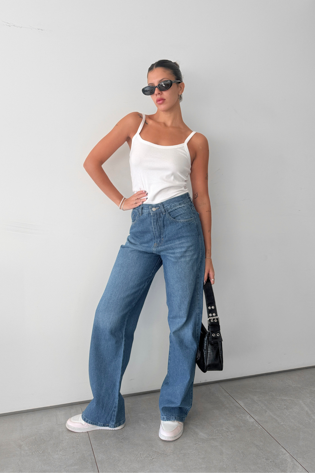 Tiro medio alto y de pierna ancha con bolsillos.