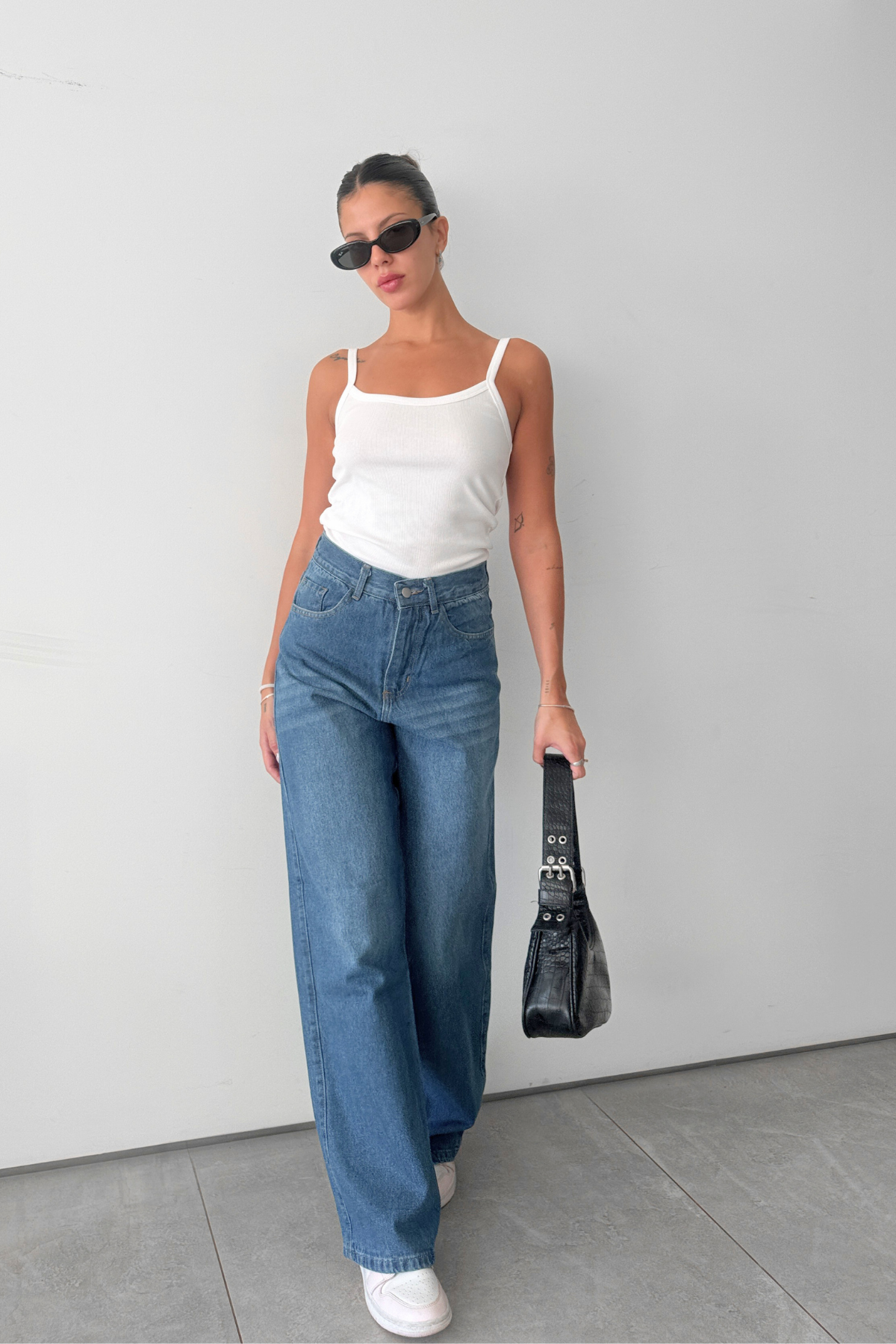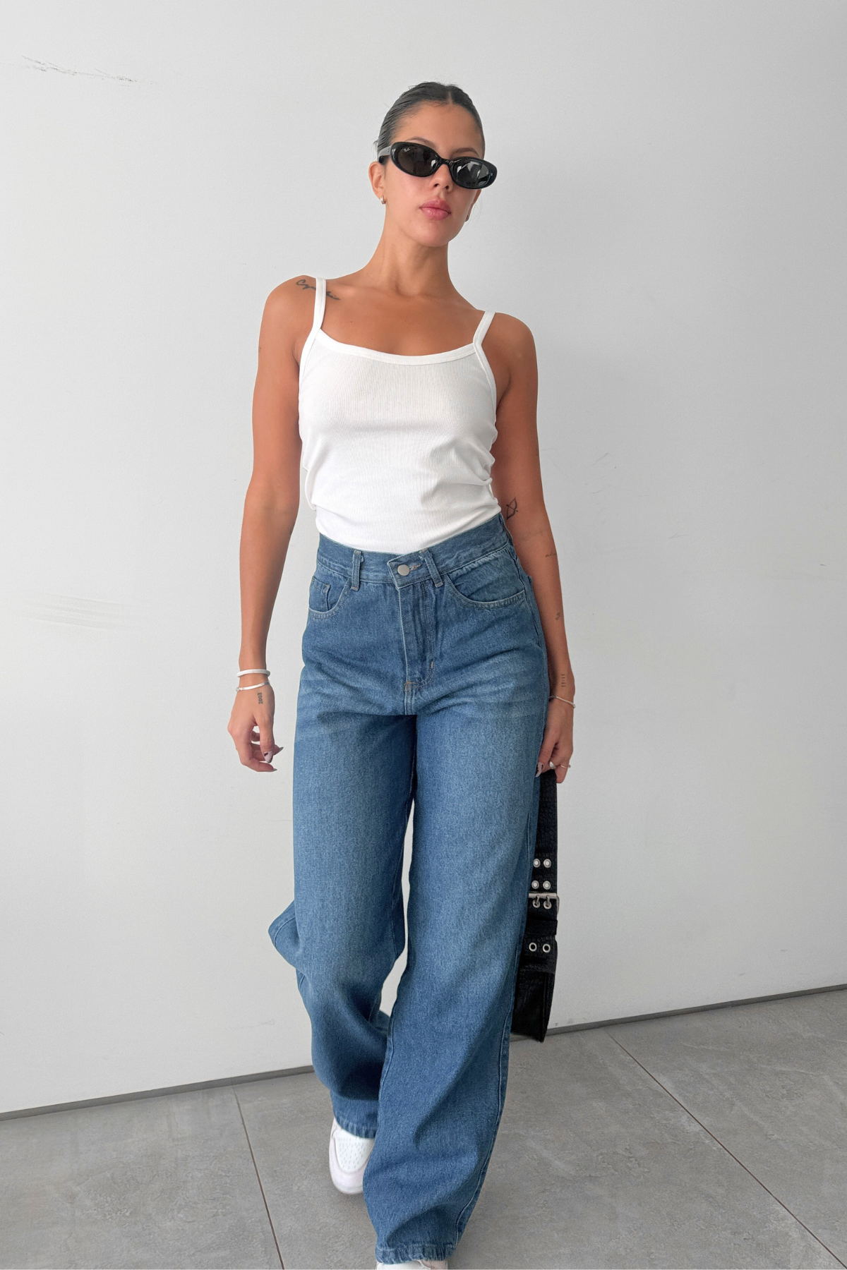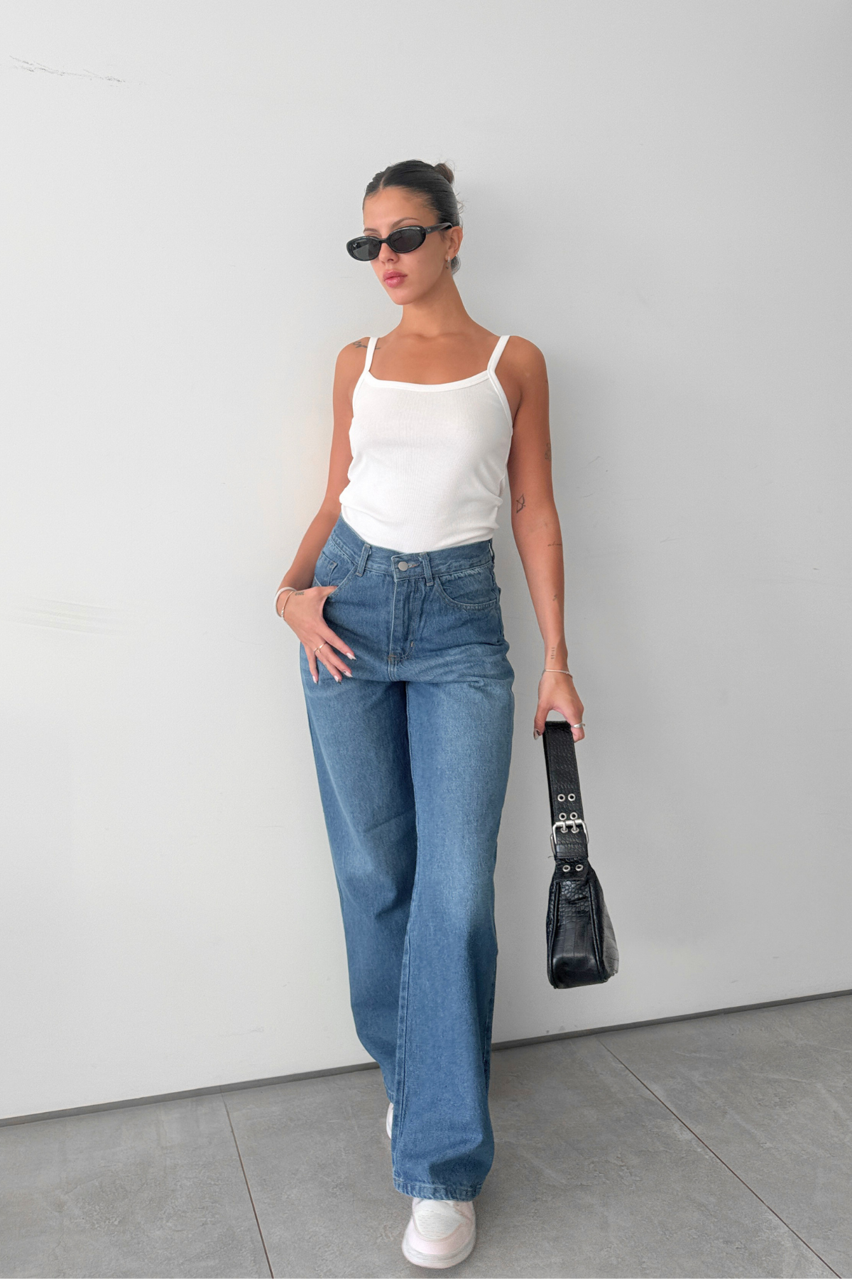 Tiro medio alto y de pierna ancha con bolsillos.